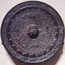 The reverse, decorated side of an Eastern-Han bronze mirror with feline heads in a scalloped field; the mirror is inscribed with the date of manufacture (174 AD)