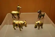 Gilded bronze animal figurines from the Han dynasty, including a horse, elephant, cow, and unicorn