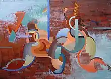 Branson's style varied over the course of her career. Her first paintings were meticulous copies of Classical Persian and Indian art in the Metropolitan Museum of Art.[1]: 13 This form of self-instruction followed advice from two instructors at Columbia's Teachers College who were also members of the Society of Independent Artists, Arthur Wesley Dow and Charles Martin.[1]: 10 She later said that Martin helped her to develop the confidence needed to apply the skills this copying gave her as she developed the abstract style of her mature art.[1]: 35 Other painters who gave her informal instruction were A. S. Baylinson and Kenneth Hayes Miller. Some of her paintings were pure abstractions and many had discernible subjects, whether figures[1]: 19 or objects in nature.[1]: 23 Some had cubist elements,[1]: 50 others surrealist,[6] but the dominant theme was the deployment of color forms to convey emotion. In 1935 the introductory statement to an art exhibition catalog maintained that she was "working in purely abstract forms in which she feels she can best convey her joy in color. She believes that all the depth of emotion that can be experienced thru sound, can also be experienced thru color."[1]: 35 Branson's painting, "Dawn" (at left), illustrates her purely abstract style. The seascape, "C. P. Dey" (at right), shows a treatment of objects in nature. Her self-portrait (at left), illustrates Branson's handling of figures. Her painting, "Dancing Rhythm" (at right) illustrates Branson's use of color to convey emotion.