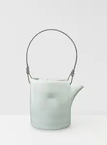 In 1990 de Waal obtained a Daiwa Anglo-Japanese Foundation Scholarship, under which he spent a year obtaining a post-graduate diploma in Japanese language at Sheffield University[15] and continued an additional year's study.[2] Whilst studying in Japan at the Mejiro Ceramics studio de Waal also worked on a monograph of Bernard Leach, researching his papers and journals in the archive room of the Japanese Folk Crafts Museum.[16] During this time de Waal began to make series of porcelain jars with pushed-in, gestural sides, arranged in groups and sequences.