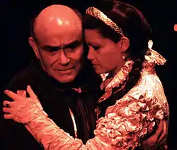 Alex Peckman as the Earl of Warwick and Julie Hughett as Countess of Salisbury in the Carmel Shakespeare Festival production of Edward III, August 2001
