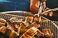 Kabayaki is a typical preparation of the unagi eel in Japan.,[13] sometimes extended to preparation of other fish,[14][15] where the fish is split down the back[14] (or belly), gutted and boned, butterflied, cut into square fillets, skewered, dipped in a sweet soy sauce-base sauce before broiled on a grill. | |