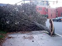 The winds downed trees throughout the area, some of which hit homes and vehicles. In Amelia County, strong winds removed a mobile home from its foundation and destroyed it.[18] Falling trees killed two in the area—one in Chesterfield County and one in the city of Richmond.[7] The downed trees snapped many power lines, leaving about 365,000 Dominion Virginia Power customers in the Richmond area without power.[13] A portion of the roof of The Diamond, home of the Richmond Braves, was damaged by the winds.[26]