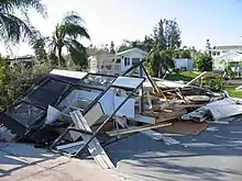 At Lake Harbor, a tiny lakefront community near the western boundary of Palm Beach County, only seven homes were left standing after the hurricane.[95] About 743 homes[92] – roughly 80% of the dwelling in South Bay – were damaged,[93] and 63 residences were destroyed.[92] The city hall and the fire station suffered heavy roof damage.[96] In Canal Point, trees, branches, power lines, and electrical poles were toppled. Almost complete destruction of the community's mobile homes parks occurred. Several other homes and buildings were inflicted with serious damage.[89] Overall, damage occurred at about 60% of homes in Canal Point.[94] Some historical buildings damaged by hurricanes Frances and Jeanne in 2004 were destroyed by Wilma.[97] State Road 80, one of the only routes between eastern and western Palm Beach County, was closed after a Florida Power & Light transmission line fell across the highway about 1 mi (1.6 km) west of Lion Country Safari.[91] At the Loxahatchee National Wildlife Refuge (NWR), 85% of tree islands – "small, wetland forest communities imbedded in a matrix of freshwater marsh" – were damaged by the storm. Less than 50% of the canopies were removed at most tree islands, while the tree islands that suffered the worst impact had larger trees and were near the center of Loxahatchee NWR.[98] The office and visitor centers were both severely damaged and later rebuilt.[99]