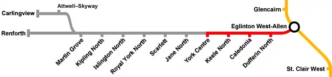The expanded line would have served a suburban residential area and included six stations between Jane and Martin Grove. Continuing west, the line would have split into two branches to serve commercial–industrial areas near the airport. One branch would have diverted to Dixon Road and terminated at Carlingview, while the other would have stayed on Eglinton Avenue to Renforth. Stations on this line would likely have had bus connections available:
