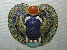 More ordinary works of art were also designed to evoke mythic themes, like the amulets that Egyptians commonly wore to invoke divine powers. The Eye of Horus, for instance, was a very common shape for protective amulets because it represented Horus' well-being after the restoration of his lost eye.[115] Scarab-shaped amulets symbolized the regeneration of life, referring to the god Khepri, the form that the sun god was said to take at dawn.[116]