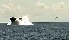 After the recovery was complete, on 25 November, Ehime Maru was lifted, towed back out to sea suspended about 90 feet (27 m) below the towing barge, and scuttled in 6,000 feet (1,800 m) of water 12 nautical miles (22 km) south of Barbers Point.[68][69] The event was witnessed by three of Ehime Maru's victims' families on board Chihaya. The total cost of the salvage operations was about $60 million.[70]