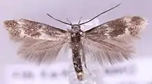 The wingspan is 8–12 millimetres (0.31–0.47 in).[1] Adults are on wing from May to August.[2] The head is grey, whitish sprinkled. Forewings are dark grey, basal area in female whitish ; a nearly straight fascia before middle, a tornal spot and costal spot beyond it united into a rather irregular fascia whitish, in female clearer ; cilia round apex more whitish. Hindwings are rather dark grey.[3]