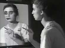 "The godmother of SHE DEVIL 8 is Elaine Shemilt with the video performance Doppelgänger. The work is part of a series of video experiments by women artists in the 1970s and 1980s, rediscovered and digitally remastered by the research project REWIND,.... Doppelgänger is one of two still existing videos of a series begun by Shemilt in 1974, salvaged in 2011. The term doppelgänger is used in German culture to indicate the evil twin (doppel / double, and gänger / goer). The doppelgänger of Elaine Shemilt is utterly feminine. The artist puts on makeup in front of the mirror in a ritual divided between the face and its reflected image that generates the double, the absolute protagonist of the finale."[23]