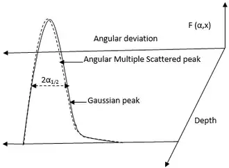 Propagation of multiple scattering angular distribution through matter. The half-width of the angular distribution is α1/2. There is a considerable difference between the shape of Gaussian peak (ideal condition) and angularly deviated peak.[40]