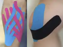 Elastic therapeutic tape, also called kinesiology tape or kinesiology therapeutic tape, Kinesio tape, k-tape, or KT[1] is an elastic cotton strip with an acrylic adhesive that is purported to ease pain and disability from athletic injuries and a variety of other physical disorders.[2][3][4] In individuals with chronic musculoskeletal pain, research suggests that elastic taping may help relieve pain, but not more than other treatment approaches, and no evidence indicates that it can reduce disability in chronic pain cases.[5]