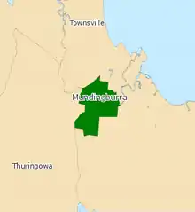 The seat is one of four within the Townsville urban area in North Queensland. Significant utilities within the Mundingburra electorate are the Townsville Hospital, the Douglas Campus of James Cook University and Stockland Shoppingcentre. Suburbs of the electorate include Heatley, Cranbrook, Aitkenvale, Mundingburra, Vincent, Douglas, Annandale, Gulliver, Mysterton, Rosslea, part of Kirwan and Pimlico north of the Ross River.[2][3]
