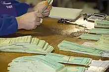 In voting for the Australian Capital Territory Legislative Assembly, voters may choose between voting electronically or on paper.[49] Otherwise, Australian elections are carried out using paper ballots. If more than one election takes place, for example for the House of Representatives and the Senate, then each election is on a separate ballot paper, which are of different colours and which are deposited into separate ballot boxes.