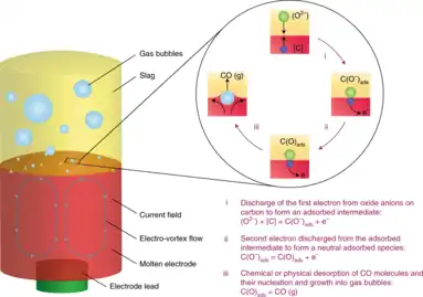 In electrorefining, decarburization process happened in electrochemical cell that composed of inert electrode, slag and steel. During the process, current passing through the cell and made slag and steel melted. Oxygen ion from slag decompose and oxidize carbon on steel and to form CO. That decarburizing reaction is occurred in three steps as follow.[7] (ads) means adsorbed intermediate