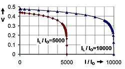 Solar cell output voltage for two light-induced currents IL expressed as a ratio to the reverse saturation current I0[52] and using a fixed ideality factor m of 2.[53] Their emf is the voltage at their y-axis intercept.