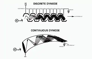 - ↑ Burroughs, E. G. (1969), "Collection Efficiency of Continuous Dynode Electron Multiple Arrays", Review of Scientific Instruments, 40 (1): 35–37, Bibcode:1969RScI...40...35B, doi:10.1063/1.1683743