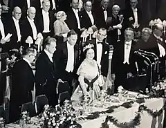 In summer 1938, a state visit to France by the King and Queen was postponed for three weeks because of the death of Elizabeth's mother, Lady Strathmore. In two weeks, Norman Hartnell created an all-white trousseau for Elizabeth, who could not wear colours as she was still in mourning.[48] The visit was designed to bolster Anglo-French solidarity in the face of aggression from Nazi Germany.[49] The French press praised the demeanour and charm of the royal couple during the delayed but successful visit, augmented by Hartnell's wardrobe.[50]
