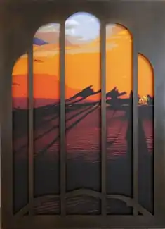 Much of Sher's later work is inspired by artist residencies abroad, during which she accumulates small drawings and paintings, photographs and video that serve as source material upon return.[3][63][64] Her show, "Morocco: Seen and Unseen" (2019), filtered North African culture through her experience as a visitor, pairing local colors and tourist-themed photos (camels, mosques) with wooden screens suggesting mashrabiyas—"harem windows" used to for privacy and shielding from male gazes (e.g., Filtered View #1).[65] Sher's artist books, Nuggets (2009), 7 Days in Otranto (2015) and Snow Lines (2018) arose, respectively, out of residencies in New Zealand, Italy and Iceland, where the loss of snow on glaciers inspired her work.[66][62]