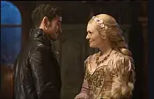 In the Wish Realm, shortly after Snow White and Prince Charming have stopped Regina from casting her curse, Regina approaches Hook to inform him of the turn of events and tells him that she's in need of magic if they are to have any hope of carrying out their planned missions. Hook agrees to venture off into another realm to obtain magic for her from a witch.