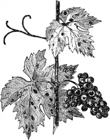 Illustration from 1892 depicting Grape Anthranose symptoms on grape shoots, leaves, and berries.