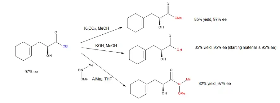 Initially, the value of the method developed by Evans and coworkers was proved by successfully converting the resulting alpha-hydroxy ester into the corresponding methyl ester, free acid, Weinreb amide and alpha-azido ester, without any racemization, as shown in Figure 18.[17] The azide displacement of the alcohol that results from the carbonyl ene reaction provides a facile route towards the synthesis of orthogonally protected amino acids.