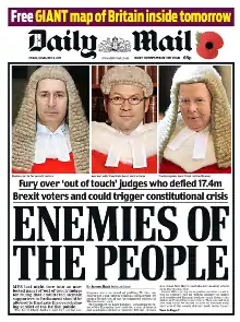 "Enemies of the People" was the headline to an article by the political editor James Slack, published in the British newspaper Daily Mail on 4 November 2016.[1] The headline and associated article were about the three judges who had ruled that the UK Government would require the consent of Parliament to give notice of Brexit. The headline was widely criticised as being inappropriately condemnatory and attracted numerous complaints, given that the British judiciary is independent of the Government. The court had ruled on the question of whether the Constitution of the United Kingdom permitted the government to use the royal prerogative to invoke Article 50 (or whether it would need to be authorised by an explicit act of Parliament to do so).