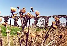 Today its ruins include the remains of walls, a temple, an acropolis, an aqueduct, and many houses, all built in basalt.