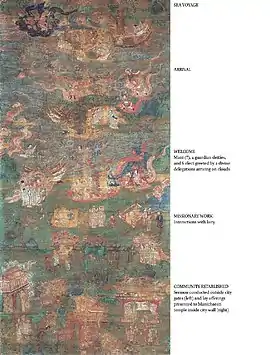 The fourth scene is divided into four smaller scenes, describing the interaction between the priests and the laity, that is, the missionary work. The fifth scene can be divided into two parts, left and right, separated by a city wall. The left side describes a sermon meeting, which should be held in a natural environment on the outskirts; the right side is a Manichaean temple in the city, where lay believers gather in front of the temple to make offerings. The last scene can be seen as a summary of the entire painting, showing the success of the mission and the final establishment of the Mani Church. Therefore, what is depicted in "Mani's Community Established" is naturally a follow-up event of this painting. [2]