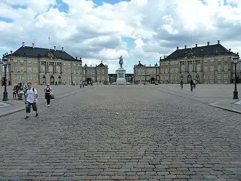 An equestrian statue of King Frederick V of Denmark stands in the center of Amalienborg Square, Copenhagen, framed by the four symmetrical wings of the Amalienborg palace.[2] The statue portrays the king in classic attire, crowned with laurels and with his hand outstretched, holding a baton.[3] Commissioned by the Danish East India Company, it was designed in Neoclassical style by Jacques Saly in 1768 and was cast in bronze in 1771.[4] The apparent dignity and tranquility in the depiction of the king is typical of Danish representations of monarchs.[5] It is considered to be one of the notable equestrian monuments of its time.[6]