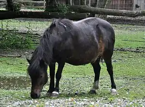 Pasture is often eliminated from the diet, since digestible energy levels from grazing are not easily measured and pasture carbohydrates can trigger laminitis.[19] It may be introduced back into the diet following improvement of insulin sensitivity. In horses with mild insulin resistance, this is often the case once obesity is resolved.[1] However, pasture access should be restricted to those times of day when grass NSC levels are lowest, such as early morning, and never following a frost, which stresses the grass and results in accumulation of water-soluble carbohydrates.[20] Horses are best managed by only allowing short grazing periods—less than 1 hour since they can rapidly ingest grass,[18] or confining them to a limited turn-out area or by use of a grazing muzzle. Horses with severe IR, that have recurrent laminitis, are not recommended to return to pasture.