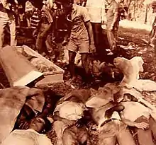 Accounts of the number of casualties vary: between twenty and thirty dead,[1][3][4] and thirty wounded.[3] After the crowd had dispersed, the site was cordoned off by the paramilitary units and onlookers were ordered to bring the wounded to hospitals in the town. The bodies were recovered from the rally site and in the sugarcane fields surrounding the location. Buildings and concrete walls nearby were riddled with bullet holes.