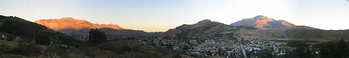 Owing to its location on the immediate leeward side of the Andes, Esquel has a cool summer Mediterranean climate (Köppen Csb) bordering on a Humid continental climate (Köppen Dsb).[3] Other climate systems, such as the Trewartha climate classification, place it within the oceanic zone (Do), like much of Western Europe and the Pacific Northwest. Temperatures are relatively cold for its climate due to its higher altitude.[3] Summers are mild with warm temperatures during the afternoon followed by cool nights.[4] The mean temperature during the summer is around 14 °C (57.2 °F).[3] It's the sunniest season, averaging as much as 10 hours of sunshine per day in January with an average of 7–8 clear days and only 5-7 overcast days.[3][5] Spring and fall are transition seasons featuring mild temperatures during the day and cool to cold nights.[4] Spring starts out with cool temperatures during the day and very cold nights which progressively becomes warmer.[4] Both spring and fall have highly variable weather.[6]
