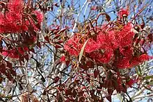 Red-flowered mallee is found in the southern Wheatbelt region of Western Australia where it grows in shrubland and open woodland in sandy-clay soils with lateritic gravel.[2] It is found from near Wongan Hills to near Corrigin and as far east as Southern Cross.[2][4]