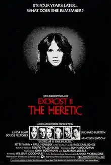 Exorcist II: The Heretic is a 1977 American horror film directed by John Boorman and written by William Goodhart. It is the second installment in The Exorcist film series and the sequel to The Exorcist (1973). The film stars Linda Blair, Richard Burton, Louise Fletcher, Max von Sydow, Kitty Winn, Paul Henreid, and James Earl Jones. The plot is set four years after the previous film and centers on the now 16-year-old Regan MacNeil, who is still recovering from her previous demonic possession.
