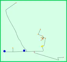 Layout of Expanded Owens Valley Solar Array (EOVSA) with 15 antennas. Smaller orange dots are thirteen 2.1-m antennas. Blue dots are two 27-m antennas. Yellow rectangle is a control building.[7]