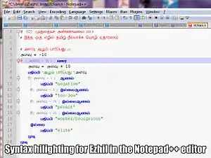 • Ezhil language has syntax highlighting support for Notepad++ and Emacs
