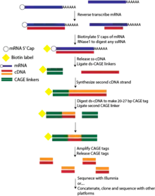 The general steps are as follows: cDNA is reverse transcribed from mRNA using random or oligo dT primers. The cap trapper method is then employed to ensure selection of full length cDNA. This entails adding biotin to the 5' cap, and subsequent capture with streptavidin beads after an RNase digestion step to remove single stranded RNA that has not hybridized to cDNA. Following cap trapping, the cDNA is separated from the RNA-cDNA hybrid. A double-stranded CAGE linker that is also biotinylated is ligated to the 5' end of the cDNA, and the second strand of the cDNA is synthesized. This resulting dual stranded DNA is digested with the Mme1 endonuclease, cutting the CAGE linker and producing a 20-27bp CAGE tag. A second linker is added to the 3'-end and the tag is amplified by PCR. Finally, the CAGE tags are released from the 5' and 3' linkers. The tags can then be sequenced, concatenated or cloned.[4][14][15][16] At the time, CAGE was carried out using the RISA 384 capillary sequencer that had been previously established by RIKEN.[1]