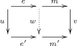Suppose e and m are two morphisms in a category C. Then e has the left lifting property with respect to m (respectively m has the right lifting property with respect to e) when for every pair of morphisms u and v such that ve = mu there is a morphism w such that the following diagram commutes. The difference with orthogonality is that w is not necessarily unique.