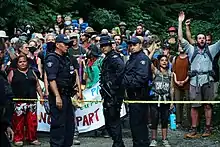 In addition to the July 2021 court action against the RCMP initiated by media outlets, Rainforest Flying Squad reported individual journalists and protestors had submitted over a dozen complaints against the RCMP by August 2021. Complaints included excessive force, confiscation of food and water, and unlawful apprehension of personal possessions, vehicles, and items providing media access, including a satellite dish.[36] The RCMP came under further criticism when a number of its officers were seen wearing thin blue line patches while on duty at the site, despite official RCMP guidelines forbidding the symbol.[37][38]