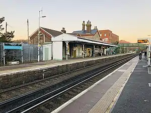 The original station was approximately 53 chains east of its present location, and opened on 8 June 1846. It was moved to its present location, much closer to the village, on 1 August 1865, and rebuilt in 1890.[1] The buildings on the down (eastbound) platform date from this time, but modern replacements have been installed on the westbound side.