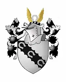 FARRER: Thomas Farrer, 1st Baron Farrer, of Abinger Hall, Dorking, (1819–99), was created Baron Farrer of Abinger, 1893. The title became extinct on the death of Oliver Farrer, 4th Baron Farrer in 1954. Arms: Argent on a bend engrailed Sable four horse shoes of the field. Crest: a quatrefoil with a horseshoe between two wings all Argent. Supporters: on either side a horse reguardant Argent gorged with a riband pendant therefrom an escutcheon both Sable charged with two horseshoes palewise Argent. Motto: Ferre va ferme.[19]