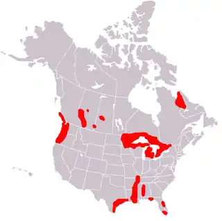 During the 20th century, F. magna was reported in these American states: Arkansas, California, Colorado, Illinois, Iowa, Kansas, Louisiana, Michigan, Minnesota, Montana, New York, Oklahoma, Oregon, South Carolina, Texas, Washington, and Wisconsin. Areas of New England are not areas normally inhabited by F. magna, but the fluke has been reported in this region. In Canada, the fluke was reported in Alberta, British Columbia, Ontario, and Quebec.[2][4] Currently, F. magna is enzootic in five major areas: (1) the Great Lakes region; (2) the Gulf coast, lower Mississippi, and southern Atlantic seaboard; (3) northern Pacific coast; (4) the Rocky Mountain trench; and (5) northern Quebec and Labrador. However, within these broad ranges, actual presence of giant liver flukes varies from locally abundant to locally absent.[2]