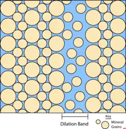 The formation of a dilation band, in unconsolidated material, is the early result of applying extensional forces.[1] Disaggregation of mineral fabric occurs along with the band, yet no offset is accommodated by the movement of grains [1] (Figure 3).