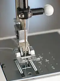 A feed dog is a movable plate which pulls fabric through a sewing machine in discrete steps between stitches.