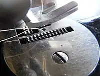 Closeup of feed dogs showing teeth rising up through the needle plate