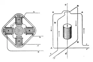 Ferraris's first publication was in March 1888, entitled Electrodynamic rotations produced by means of alternate currents.[3] After expounding the geometric theory of the rotatory magnetic field, he suggested that a simple way of procuring the desired phase-currents would be to branch the circuit of an alternate current into two parts, into one of which should be inserted a resistance without self-induction, into the other a coil of much self-induction but of small resistance. The two windings of the motor should be respectively introduced into these two branches. The difference of phase thus produced would be sufficiently near to 90° to be effective. He expressed the opinion that in this way one might obtain all the effects that can be obtained by the rotation of a magnet. He then described the following experiments which were made in the autumn of 1885.