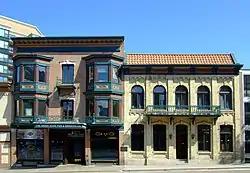 In the 1890s George Jr. bought more adjacent property and in 1901 remodeled pre-existing buildings to add the 3-story section on the left in the photo to the hotel. This section was designed by architects Gordon and Paunack in a commercial form of the Queen Anne style which was by then popular. The exterior is rose-colored brick. At street level are large shop windows. Above are the three-sided two-story oriels with pilasters at the corners. Between the oriels are French doors opening onto wrought iron balconies. At the top is an entablature with dentils and modillions beneath the cornice.[1]