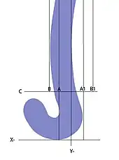 The maximum permitted 'deviation' is shown by the lines B-B and B1-B1 respectively. The line B-B is 20 mm further along the X- axis than the line A-A and the line B1-B1 is 20 mm further along the X+ axis than the line A1-A1. There is no limit to the length of a protrusion along the y-axis specified, so the deviation curve or curves may be of any length along the length of the stick-handle. Some goalkeeping sticks have an outward curve on the toe side (within the line B-B) that extends for almost half the total length of the stick.