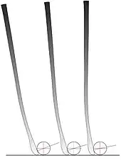 At a common playing angle three different styles of hook stick head present identical ball/handle relationships because the bend of the 'heel' is the same in each stick. An increase in the height of the toe over the ball is very noticeable and is most pronounced in the more 'open' shape. The modern hook does not suffer from the effects of a rotational imbalance in the head as much as the original did because stick heads are now generally tapered towards the toe, rather than of uniform thickness so toe height is not, from a weight and rotational balance point of view, as much of an issue as it once might have been. The stick head is also generally tapered from the midpoint of the striking area towards the bottom curve, so when the stick is in the reversed position the maximum thickness of the head is not at the highest point. This gives a more balanced rotation of the weight of the stick head over the ball.
