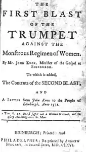 The First Blast of the Trumpet Against the Monstruous Regiment of Women[1] is a polemical work by the Scottish reformer John Knox, published in 1558. It attacks female monarchs, arguing that rule by women is contrary to the Bible.